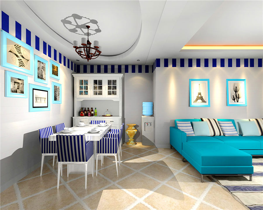 就整體布局來看,視覺上十分寬闊,顯得比較有格局。色彩搭配的話,純白色與深藍(lán)色的撞擊,不會(huì)顯得很突兀,反而給人一種眼前一亮的感覺。朱紅色與白色相間的吊燈造型,讓整體氛圍更加貼近自然。