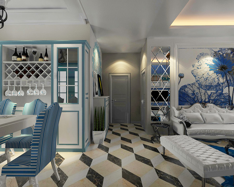 清新靚麗的色彩,讓人眼前一亮,拼接圖形 的大面積使用,讓整體氛圍更加富有神秘感,尤其是背景墻與窗簾布藝的使用,更加的凸顯文藝范,純白色的花瓶中的小花,讓整體視覺更加的溫馨與舒適。