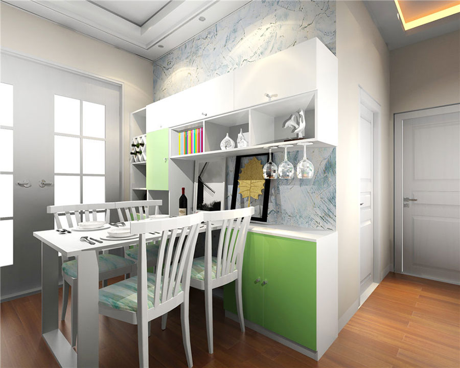 入眼可及處,滿滿的綠色縈繞,給人一種回歸自然的親切感,酒柜與書柜合二為一,充分發(fā)揮一柜兩用的收納功能,在美觀的同時盡顯收納之美。田園風(fēng)味十足的背景墻,為整體格局增添了一絲朦朧之感,令人陶醉其中。